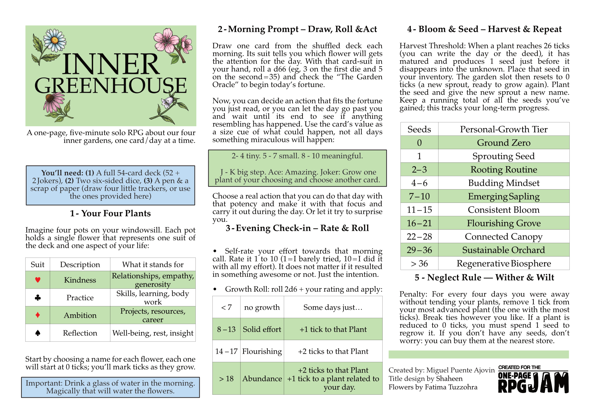 A one‑page, five‑minute solo RPG about our four inner gardens, one card a day.